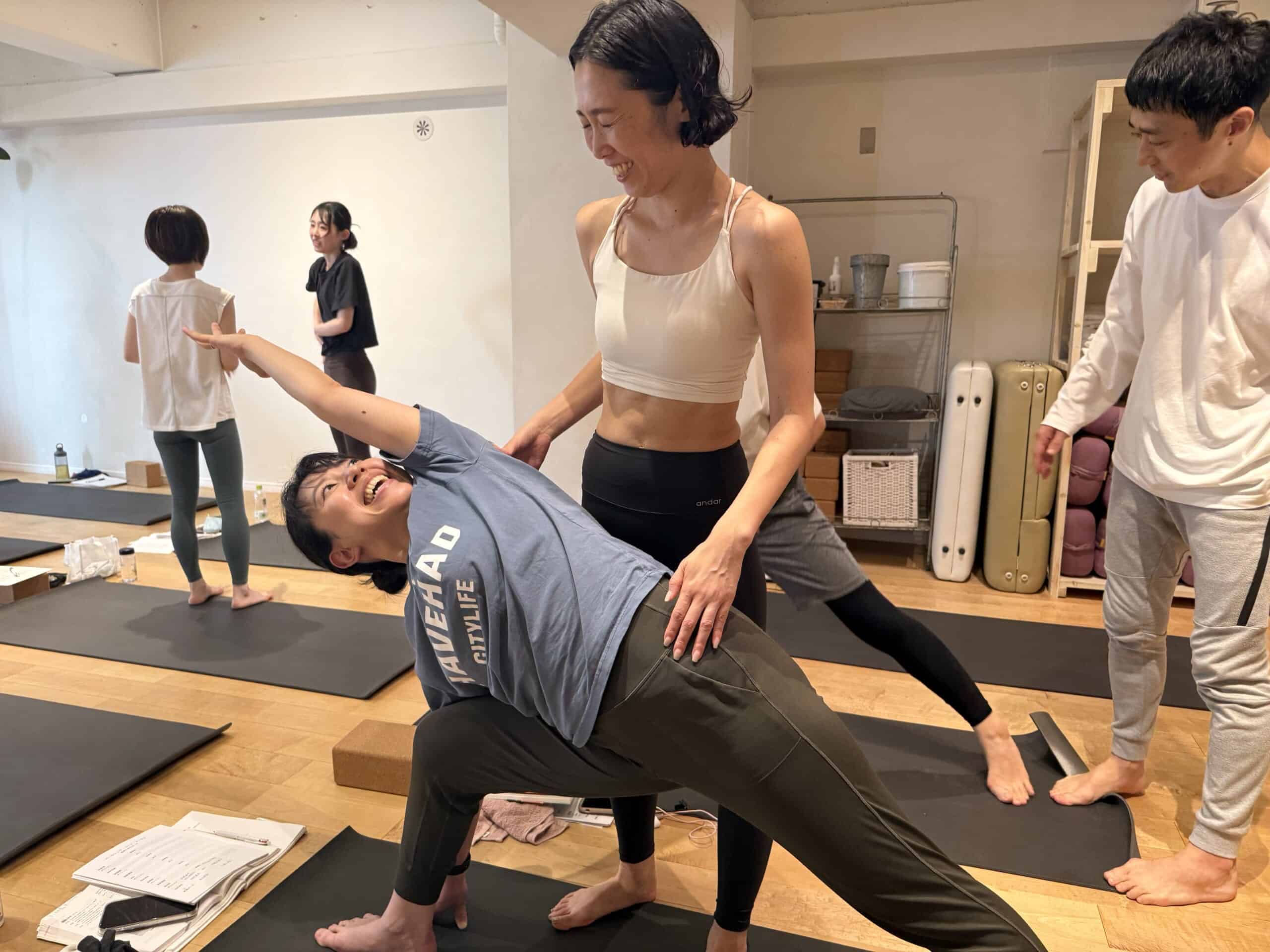 このコースの最初に“愛”を持ってアジャストをするという、先生の言葉がとても印象に残っています。同じコースの仲間同士で何度もアジャストし合うので、『この体勢、この力加減で大丈夫かな?』と実践しながら学ぶことが出来ました。相手が「気持ちいい〜!」と伝えてくれた時、自信にもなりますし、愛が届いた!と、とても嬉しくなりました。またアジャストを学べるだけでなく、自身のアーサナも、自分では気づけなかった修正点を知れたので、より深める事が出来ました。基本のアーサナから難易度の高いアーサナまで、全てと言って良いほど学ぶことが出来ました!